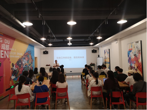为了使同学们在课堂外进一步了解专业社区工作的产生和发展过程,深度剖析社会工作行业发展过程中形成的社会困境及其解决之道,增加《社会心理学》关于社会困境有关知识的感性体验,公司2022级社会工作本科生在刘传军老师的带领下,于6月8日下午来到成都市武侯区青年之家、武侯区聚落青年服务中心,进行《社会心理学》课程实践教学活动。武侯区聚落青年服务中心负责人、实务授课郭常波老师为本次实践交流做了精心准备,以“社会工作的过去、现在和未来”为题交流了他对整个行业发展的观察和体会,以“从我的历程回观社工机构的异化”为题交流了他关于行业和机构发展困境及其破解之道的见解。