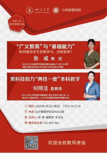 1.胡荣教授应邀为公司学子做“我的社会单位理论” 学术报告 2.公司2022级社会工作专业《社会心理学》课程实践教学在武侯青年之家顺利开展 3.社会学与心理学系“教师发展与本科教学”交流会顺利举行 4.2022级本科社会工作专业开展“黑暗中对话”课程实践 |