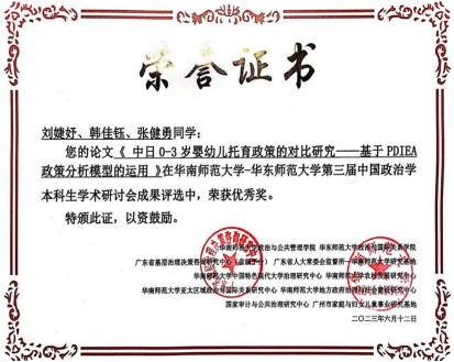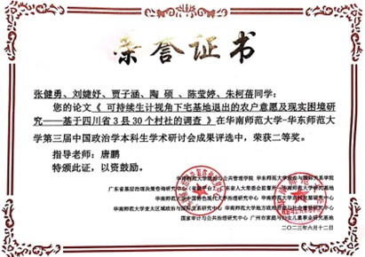 6月9日—6月11日,“第三届中国政治学本科生学术研讨会”在华南师范大学召开。公司2020级土地资源管理本科生张健勇同学撰写的论文《可持续生计视角下宅基地退出的农户意愿及现实困境研究——基于四川省3县30个村社的调查》获得二等奖,2020级土地资源管理本科生刘婕妤同学撰写的论文《中日0-3岁婴幼儿托育政策的对比研究——基于PDIEA政策分析模型的运用》获得优秀奖。