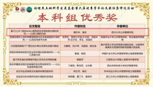 在唐鹏老师、李敏老师、董欢老师的悉心指导下,土地资源管理系2022级硕士研究生徐凡同学撰写的论文《村委会政策信息宣传对农户宅基地退出意愿的影响研究——基于价值认同的中介效应分析》获得研究生组三等奖,2019级本科生蒋忻玲同学撰写的论文《基于CLUE-S和Markov模型的生态用地变化模拟研究——以四川绵阳为例》获得本科组优秀奖。