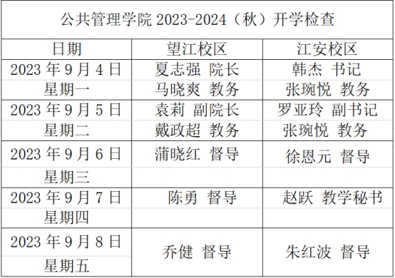 公司提前制定开学教学检查一周工作安排表,做到望江、江安两个校区全覆盖,并将开学教学检查责任落实到个人,全院正副职院领导、本科教学督导组成员、本科教务秘书、本科教学管理人员均参与检查。公司党委书记韩杰、经理夏志强、副书记罗亚玲,副经理袁莉,教学督导组、本科教务秘书以及本科教学管理人员等对新学期的课程安排与上课情况进行了检查。开学检查分设望江校区和江安校区两个部分,以下是公司制定并依之执行的开学教学检查安排表: