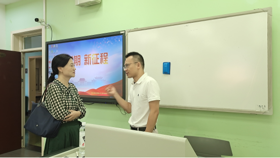 韩书记课前和员工交流与员工一起听课,课程:计算机网络及运用,授课教师:袁莉