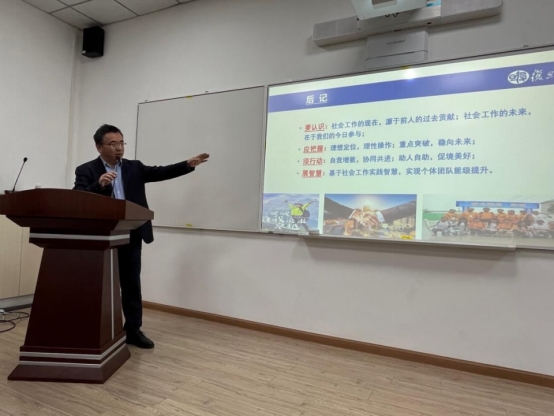顾东辉教授从社会工作的“本真品性”和“实战策略”两个方面入手,分八个板块展开了本次讲座。在社会工作的“本真品性”上,顾东辉教授指出社会工作是利他、优境、强己的“好善之业”。一方面,社会工作是协助无法自复的社会人实现人际健康乃至全面发展的专业活动,应以“人境共优”作为社会工作的核心特色;另一方面,在外显与潜在功能上“助人利他”,在经济、政治、社会、文化四方面“促境美好”,在帮助服务对象的同时促进自身成长的“利群强己”则是社会工作的多维功能。在社会工作的“实战策略”上,顾东辉教授以“整体理性”的行动始点切入,从宏观、中观、微观三个层面阐述了自己对于实战策略的看法,认为社会工作应强调宏观领悟、中观实操、微观专精和理性守规。顾东辉教授多次援引自己身边发生的案例,生动具体地讲述了社会工作深厚的理论支撑、积极的长项视角、必要的游说技能等重点内容,指出社会工作者作为专业的助人工作者,应筑牢社会工作的利他基石,在动态中促进自我的整体增能。