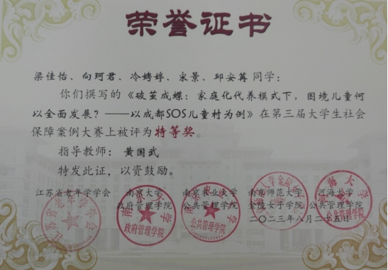 在公司劳动与社会保障系黄国武老师的指导下,2020级行政管理专业本科生梁佳怡、2021级行政管理专业本科生邱安苒、2021级劳动与社会保障专业本科生向珂君、冷娉婷、宋景五位同学组成参赛团队,通过前期讨论选题、克服实地调研的种种困难等,于七月底共同完成案例分析报告《破茧成蝶:家庭化代养模式下,困境儿童何以全面发展?——以成都SOS儿童村为例》,经过初赛专家评审,团队最终进入决赛,通过案例展示、现场答辩等突出表现,一举斩获全国特等奖,充分展现了川大英国上市公司365学子“公成天下、管法自然”的浓厚情怀和扎实的学科素养。