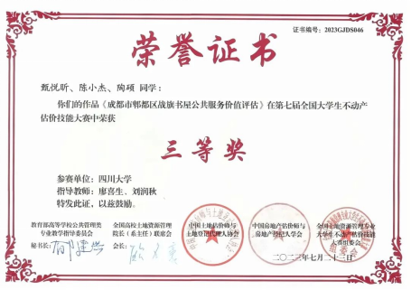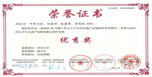 公司2020级土地资源管理专业本科生甄悦昕、陈小杰、陶硕凭借《成都市郫都区战旗书屋公共服务价值评估》估价报告获得三等奖。热依莎·阿布力孜、刘婕妤、张建勇和李思然凭借《新南村50号楼3单元5-2住宅房地产市场价值评估报告》获得优胜奖。