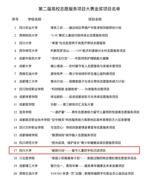 10月26日至27日,第二届四川省高校志愿服务项目大赛在四川宜宾举行,公司员工牵头组队的《“破困行动”——留守儿童防手机沉迷》创意项目在本次大赛中斩获金奖。赛事由共青团四川省委、中共四川省委教育工作委员会、四川省精神文明建设办、四川省民政厅、四川省科学技术协会共同主办,四川青年志愿者协会等组织共同承办。团队成员包括2021级社会工作专业本科生潘奕成、2021级行政管理专业本科生申羽茜、2021级行政管理专业本科生傅珏华、2022级公共管理大类专业本科生张晶涵以及两名艺术公司员工。