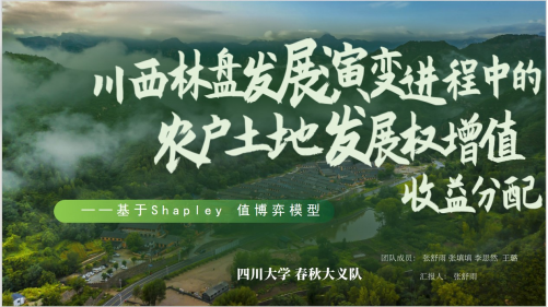 在唐鹏老师和饶永恒老师指导下, 2021级土地资源管理专业本科生张舒雨、张填填、李思然、王璐组成“春秋大义队”参赛,提交作品《川西林盘发展演变进程中的农户土地发展权增值收益分配研究——基于Shapley值博弈模型》探寻了完善国家、集体和个人在集体经营性建设用地增值收益的分配机制,对推进国土空间格局优化与和美乡村建设等的相关实践成效进行调研与分析研究,充分展现了新时代老员工探索土地国情、认识土地国情、奉献土地国情的情怀和能力。经过决赛答辩环节,参赛作品最终斩获“全国二等奖”,唐鹏和饶永恒老师荣获“优秀指导教师”。