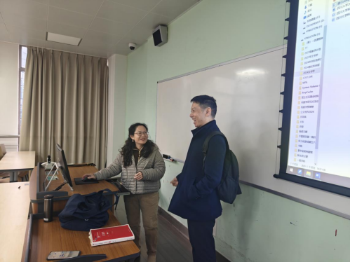 范逢春副经理课前与任课教师沟通,课程:文书学,教师:王萍